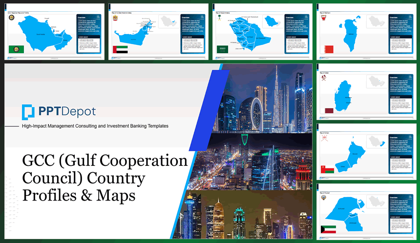 This GCC Country Profiles & Maps PowerPoint set offers a region-specific visual tool designed for consultants, investment professionals, and policy analysts presenting on the Middle East. The slides include editable maps for all six Gulf Cooperation Council (GCC) nations—Saudi Arabia, UAE, Qatar, Bahrain, Kuwait, and Oman—with individual country breakdowns, highlighting key cities, administrative regions, and geopolitical layouts.
