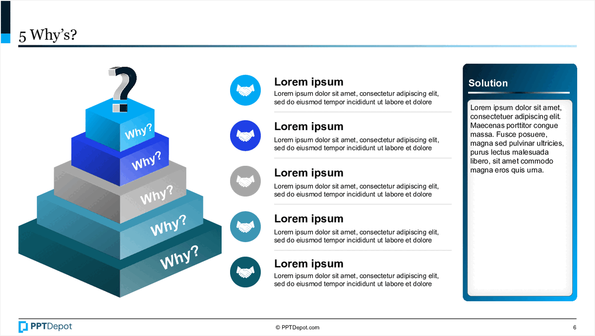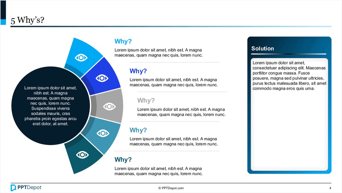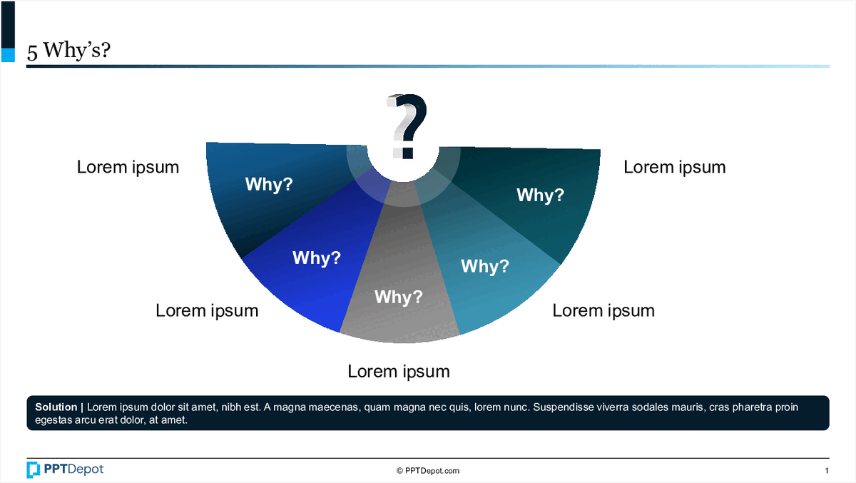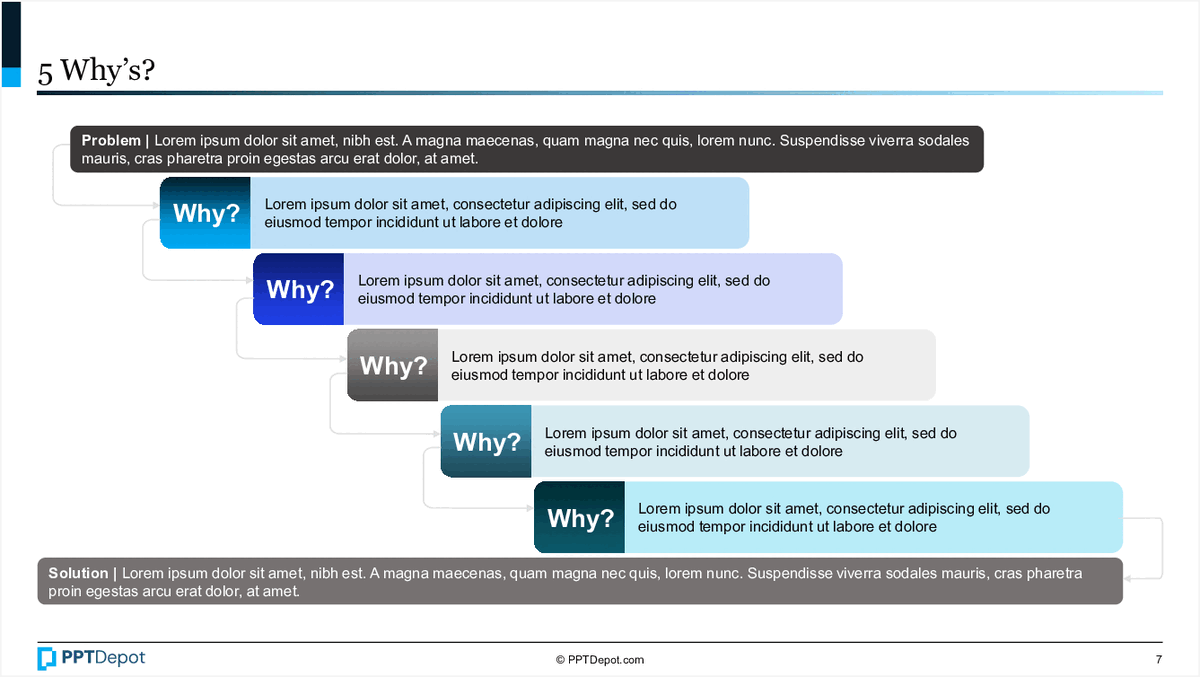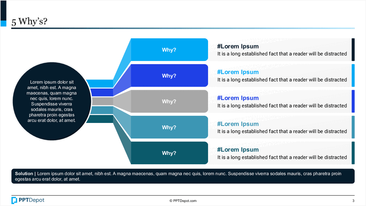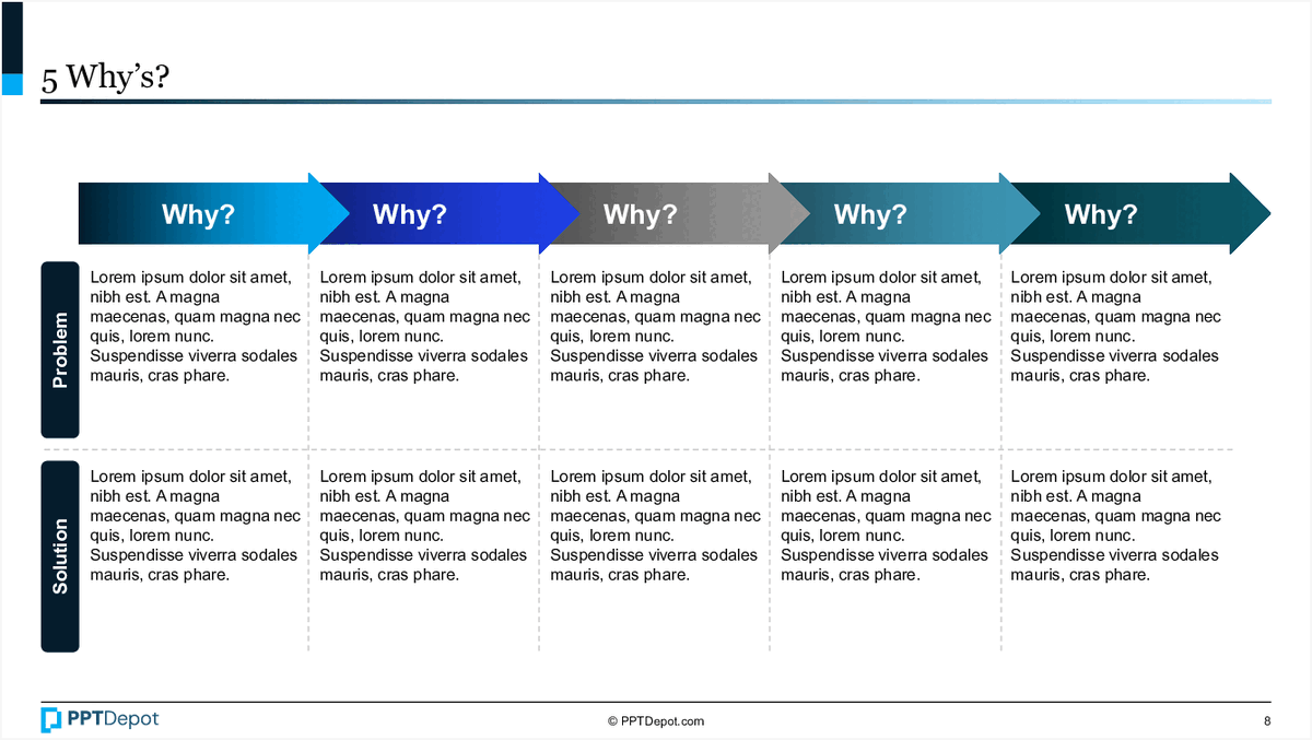 The layouts also incorporate space to capture the resolution path--such as corrective actions, countermeasures, or a short solution summary--so the slide connects analysis to action in one place. This makes the pack especially useful for operational reviews, incident retrospectives, continuous improvement discussions, and performance escalations where stakeholders expect both rigor and a clear takeaway.