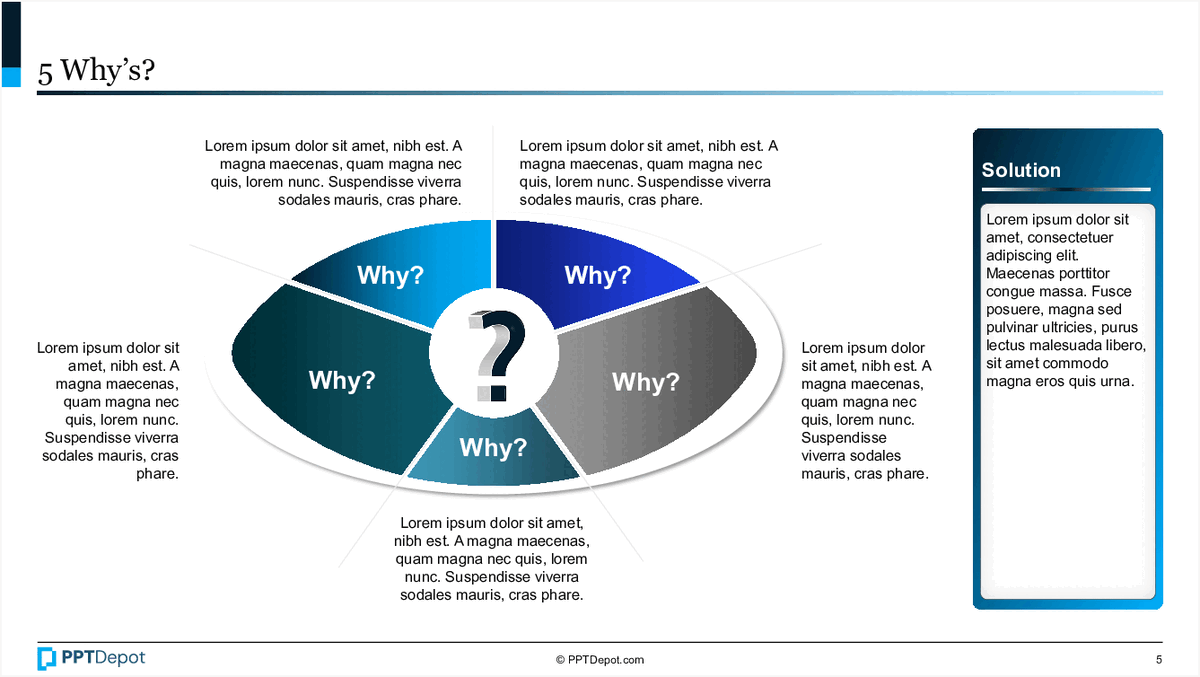 A set of 5 Whys PPT layouts for structured root-cause analysis of missed targets, with space to document solutions and next actions.