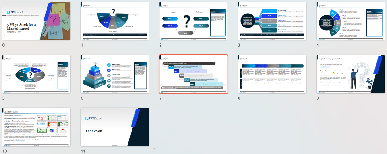 This template pack includes multiple "5 Whys" root-cause analysis layouts built around diagnosing a missed target or performance gap. The pages provide a clear step-by-step stack of "Why?" prompts that progress from the initial problem statement through deeper causal layers--helping teams document logic, avoid superficial conclusions, and converge on a defensible root cause.
