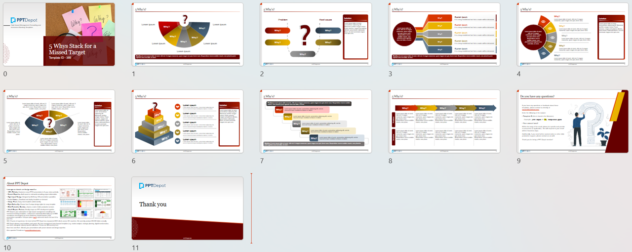 A set of 5 Whys PPT layouts for structured root-cause analysis of missed targets, with space to document solutions and next actions.