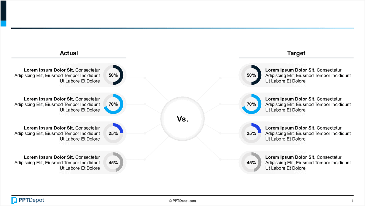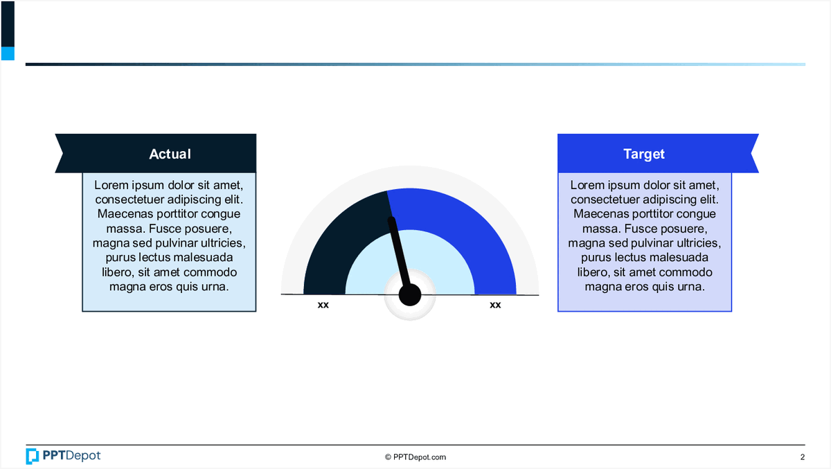 A pack of editable Actual vs. Target dial dashboard layouts for crisp KPI attainment reporting and executive updates.