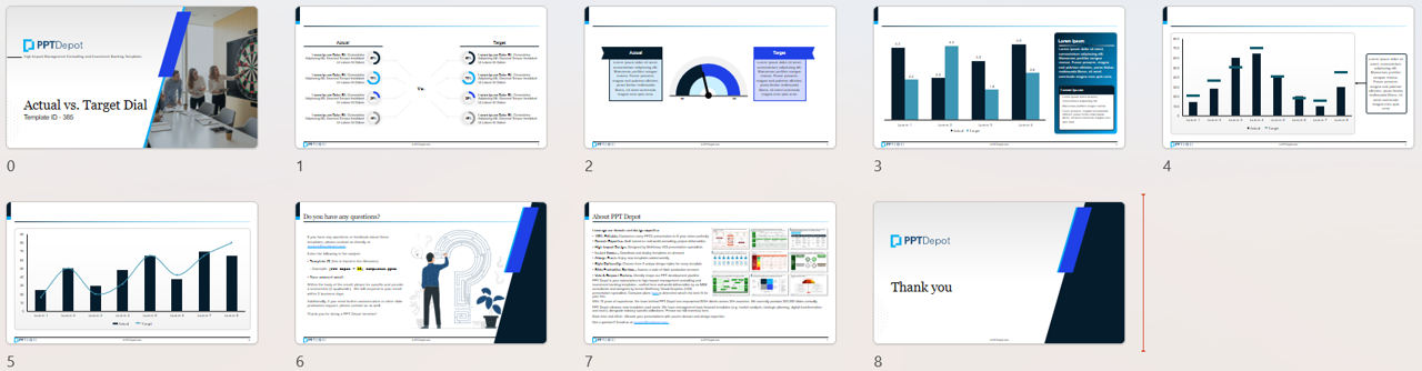 This template pack includes multiple "Actual vs. Target" dial-style dashboard layouts designed to make KPI attainment instantly readable. The pages are structured around a prominent dial visual paired with clearly labeled Actual and Target fields, so stakeholders can quickly see performance versus goal without scanning dense tables or charts.