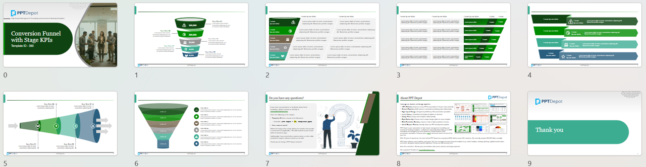 This template pack provides a set of conversion funnel layouts designed to show end-to-end performance across multiple stages, with clear KPI values displayed at each step. The slides are built for quickly communicating where volume drops, where efficiency breaks down, and which stage is the biggest lever--making them ideal for growth, sales, marketing, or product activation reporting.