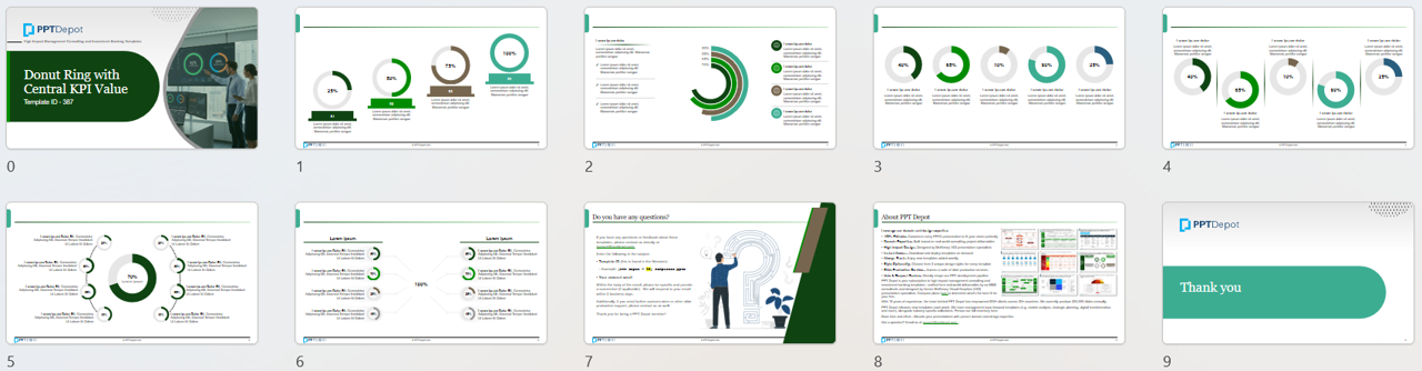 This template pack includes multiple donut-ring KPI layouts designed to spotlight a single metric at the center, supported by a circular progress/portion visual around it. It's ideal for KPIs where the headline number should dominate--attainment, completion, utilization, adoption, health scores--while the ring reinforces progress toward a goal or benchmark at a glance.