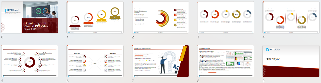 Download our 6-slide Donut Ring with Central KPI Value PowerPoint template pack: A set of donut-ring KPI PPT layouts that emphasize a central value with a clean progress visual for fast, high-signal reporting.