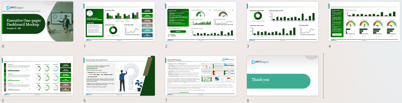 Download our 5-slide Executive One-Pager Dashboard PowerPoint template pack: A pack of executive one-page dashboard PPT layouts that combine KPI tiles, summaries, and action tracking into a single leadership-ready view.