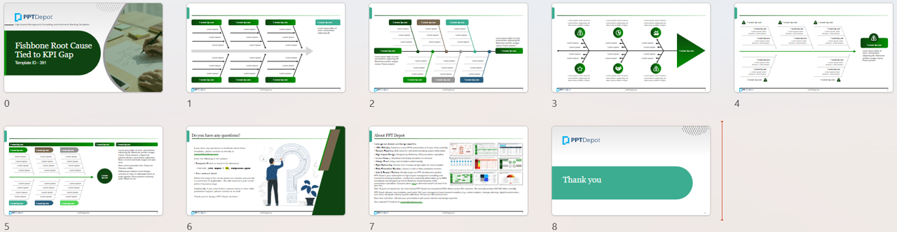 A set of fishbone root-cause PPT layouts that structure contributing factors around a defined KPI gap.