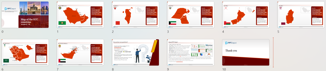 Download our 7-slide GCC (Gulf Cooperation Council) Country Maps PowerPoint template pack: This is a collection of PPT templates capturing the individual GCC country maps.