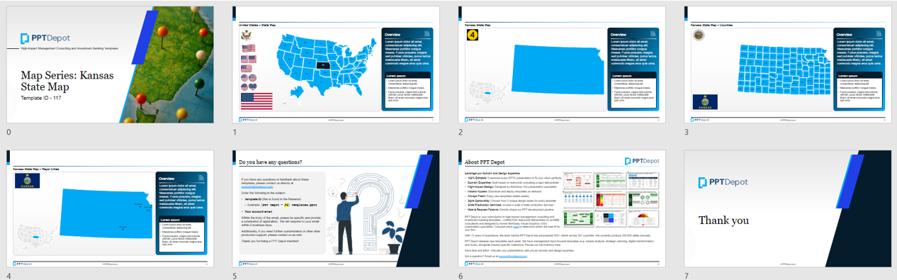 All maps are built natively in PowerPoint, making it easy to modify colors, text, and layout without relying on external design tools. Whether you're working in investment banking, private equity, consulting, real estate, government, or education, this template offers a professional-grade solution for any project that requires detailed and flexible visual PPT representation of Kansas.