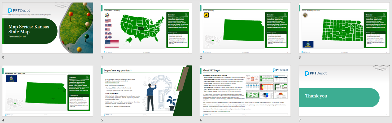 All maps are built natively in PowerPoint, making it easy to modify colors, text, and layout without relying on external design tools. Whether you're working in investment banking, private equity, consulting, real estate, government, or education, this template offers a professional-grade solution for any project that requires detailed and flexible visual PPT representation of Kansas.