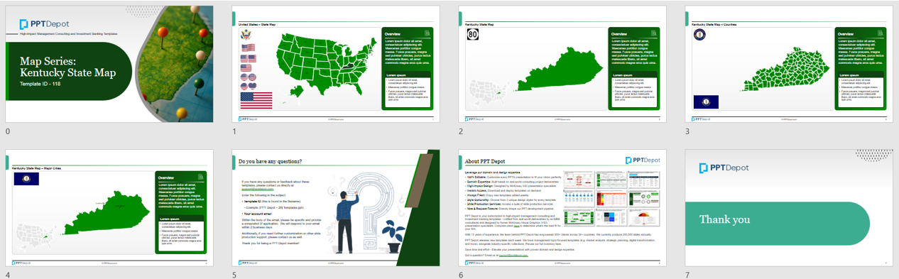 All maps are built natively in PowerPoint, making it easy to modify colors, text, and layout without relying on external design tools. Whether you're working in investment banking, private equity, consulting, real estate, government, or education, this template offers a professional-grade solution for any project that requires detailed and flexible visual PPT representation of Kentucky.