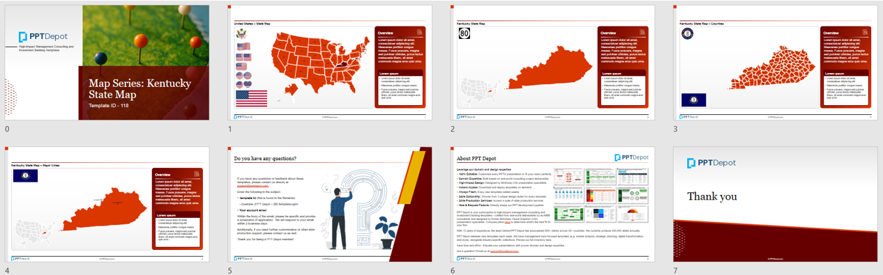All maps are built natively in PowerPoint, making it easy to modify colors, text, and layout without relying on external design tools. Whether you're working in investment banking, private equity, consulting, real estate, government, or education, this template offers a professional-grade solution for any project that requires detailed and flexible visual PPT representation of Kentucky.