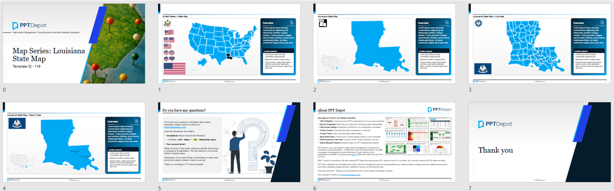 All maps are built natively in PowerPoint, making it easy to modify colors, text, and layout without relying on external design tools. Whether you're working in investment banking, private equity, consulting, real estate, government, or education, this template offers a professional-grade solution for any project that requires detailed and flexible visual PPT representation of Louisiana.