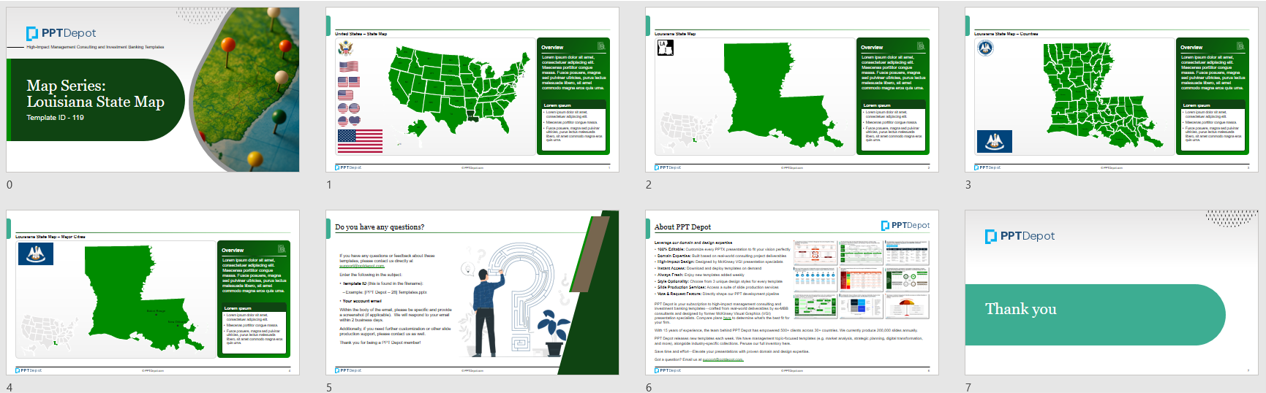 All maps are built natively in PowerPoint, making it easy to modify colors, text, and layout without relying on external design tools. Whether you're working in investment banking, private equity, consulting, real estate, government, or education, this template offers a professional-grade solution for any project that requires detailed and flexible visual PPT representation of Louisiana.