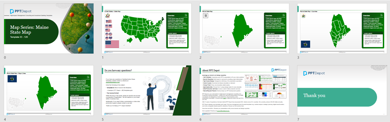 All maps are built natively in PowerPoint, making it easy to modify colors, text, and layout without relying on external design tools. Whether you're working in investment banking, private equity, consulting, real estate, government, or education, this template offers a professional-grade solution for any project that requires detailed and flexible visual PPT representation of Maine.