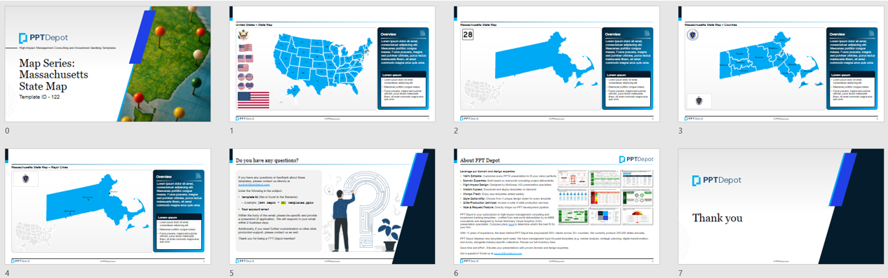 This collection of PPT templates captures the U.S. state of Massachusetts, along with its major cities and counties.