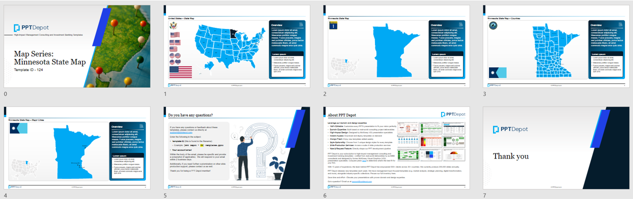 All maps are built natively in PowerPoint, making it easy to modify colors, text, and layout without relying on external design tools. Whether you're working in investment banking, private equity, consulting, real estate, government, or education, this template offers a professional-grade solution for any project that requires detailed and flexible visual PPT representation of Minnesota.