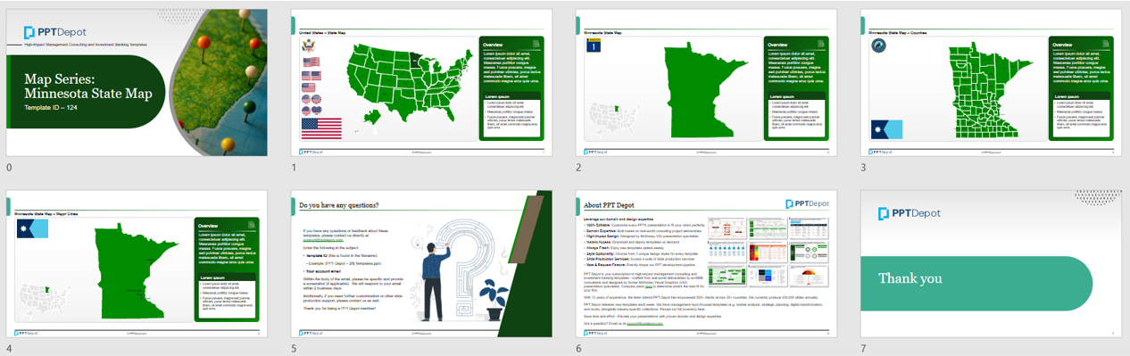 All maps are built natively in PowerPoint, making it easy to modify colors, text, and layout without relying on external design tools. Whether you're working in investment banking, private equity, consulting, real estate, government, or education, this template offers a professional-grade solution for any project that requires detailed and flexible visual PPT representation of Minnesota.