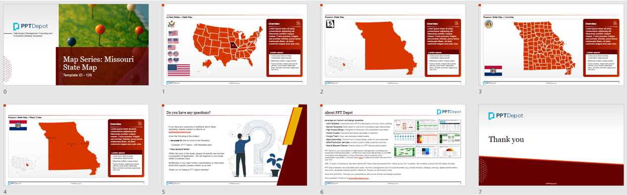 This collection of PPT templates captures the U.S. state of Missouri, along with its major cities and counties.