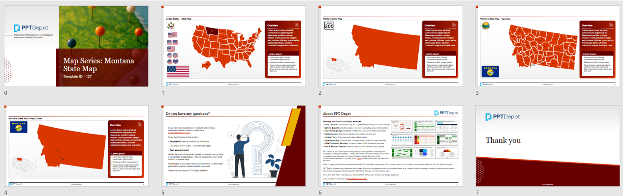 All maps are built natively in PowerPoint, making it easy to modify colors, text, and layout without relying on external design tools. Whether you're working in investment banking, private equity, consulting, real estate, government, or education, this template offers a professional-grade solution for any project that requires detailed and flexible visual PPT representation of Montana.