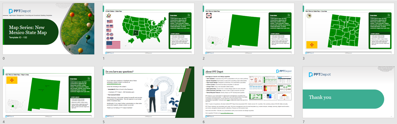 All maps are built natively in PowerPoint, making it easy to modify colors, text, and layout without relying on external design tools. Whether you're working in investment banking, private equity, consulting, real estate, government, or education, this template offers a professional-grade solution for any project that requires detailed and flexible visual PPT representation of New Mexico.