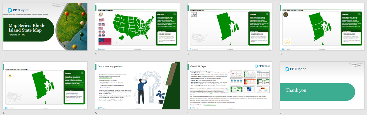 All maps are built natively in PowerPoint, making it easy to modify colors, text, and layout without relying on external design tools. Whether you're working in investment banking, private equity, consulting, real estate, government, or education, this template offers a professional-grade solution for any project that requires detailed and flexible visual PPT representation of Rhode Island.