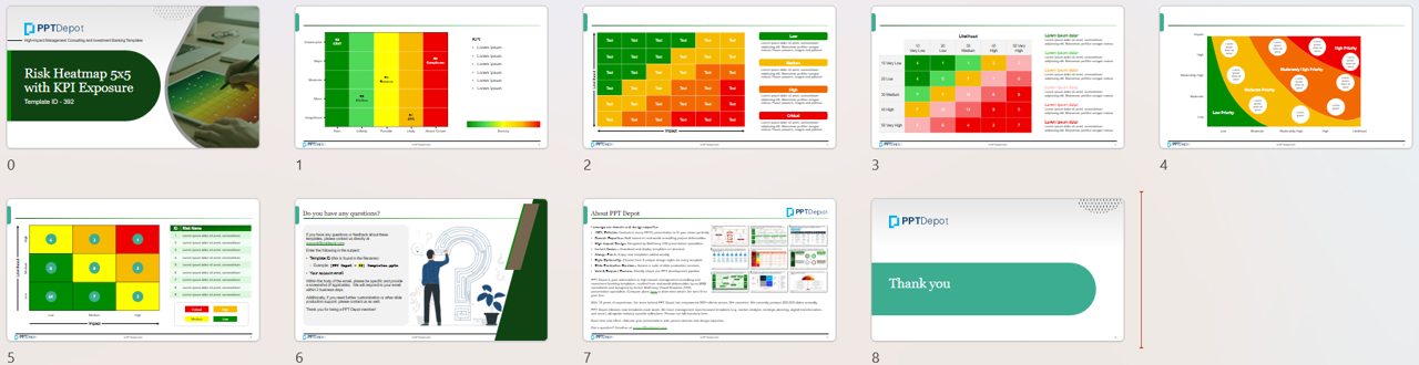 Download our 5-slide Risk Heatmap with KPI Exposure PowerPoint template pack: A set of 5×5 risk heatmap PPT layouts that prioritize risks and connect them to KPI exposure.