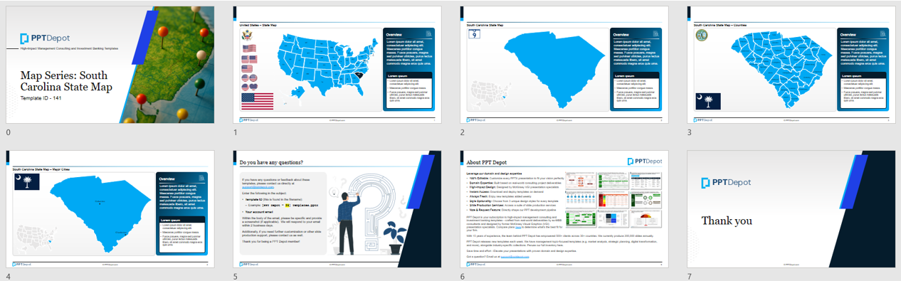 All maps are built natively in PowerPoint, making it easy to modify colors, text, and layout without relying on external design tools. Whether you're working in investment banking, private equity, consulting, real estate, government, or education, this template offers a professional-grade solution for any project that requires detailed and flexible visual PPT representation of South Carolina.