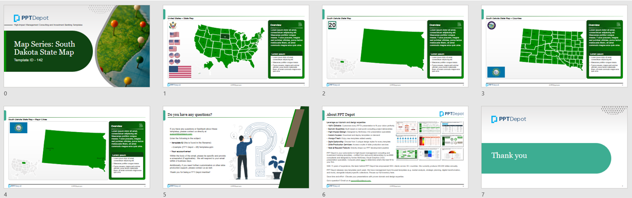 All maps are built natively in PowerPoint, making it easy to modify colors, text, and layout without relying on external design tools. Whether you're working in investment banking, private equity, consulting, real estate, government, or education, this template offers a professional-grade solution for any project that requires detailed and flexible visual PPT representation of South Dakota.