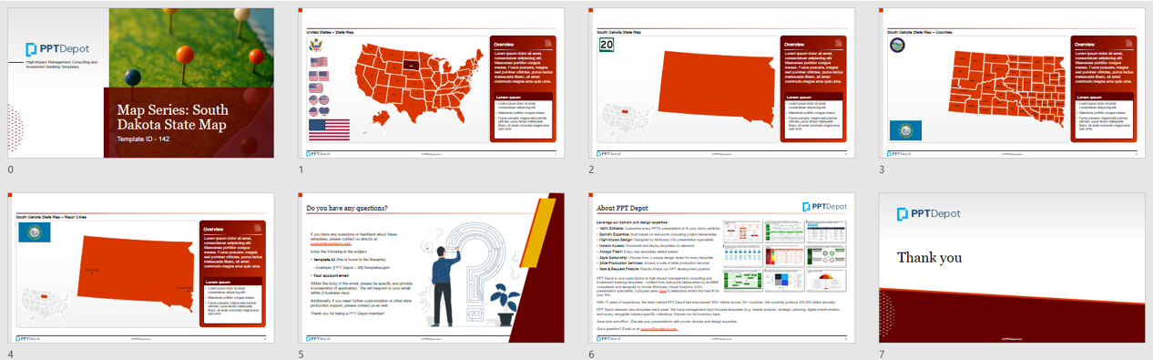 This collection of PPT templates captures the U.S. state of South Dakota, along with its major cities and counties.