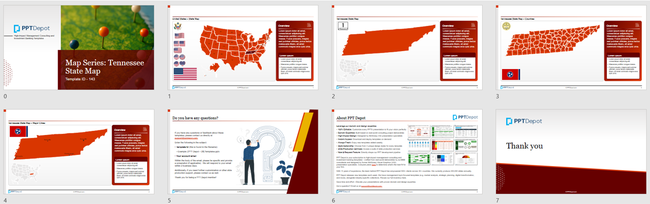 This collection of PPT templates captures the U.S. state of Tennessee, along with its major cities and counties.
