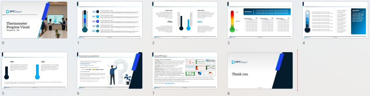 Download our 5-slide Thermometer Progress Visual PowerPoint template pack: A set of thermometer-style progress PPT layouts for clear percent-to-goal reporting in recurring updates.