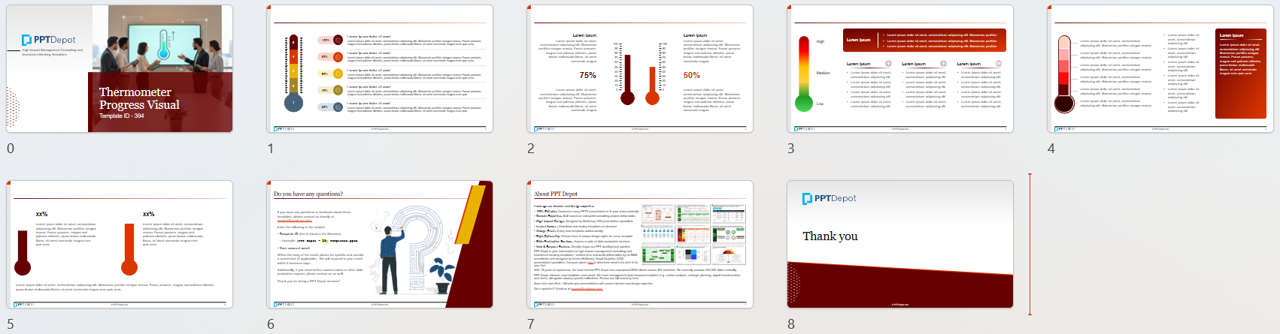 Download our 5-slide Thermometer Progress Visual PowerPoint template pack: A set of thermometer-style progress PPT layouts for clear percent-to-goal reporting in recurring updates.