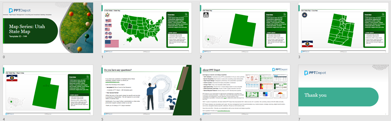 All maps are built natively in PowerPoint, making it easy to modify colors, text, and layout without relying on external design tools. Whether you're working in investment banking, private equity, consulting, real estate, government, or education, this template offers a professional-grade solution for any project that requires detailed and flexible visual PPT representation of Utah.