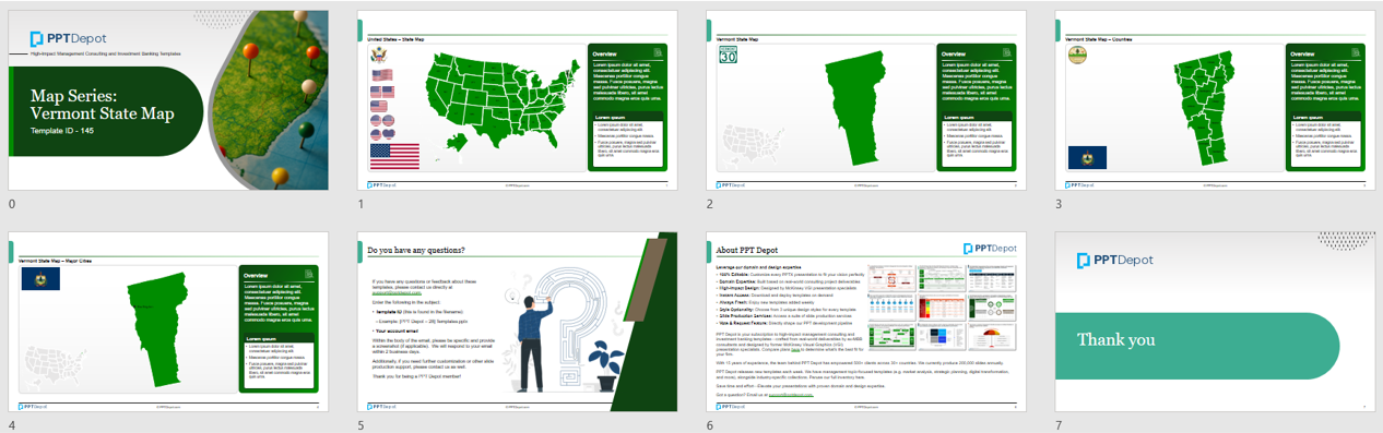 All maps are built natively in PowerPoint, making it easy to modify colors, text, and layout without relying on external design tools. Whether you're working in investment banking, private equity, consulting, real estate, government, or education, this template offers a professional-grade solution for any project that requires detailed and flexible visual PPT representation of Vermont.