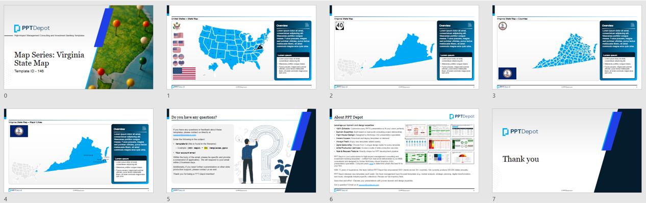 All maps are built natively in PowerPoint, making it easy to modify colors, text, and layout without relying on external design tools. Whether you're working in investment banking, private equity, consulting, real estate, government, or education, this template offers a professional-grade solution for any project that requires detailed and flexible visual PPT representation of Virginia.