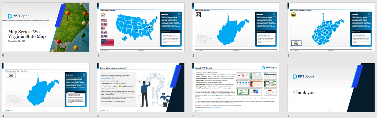 All maps are built natively in PowerPoint, making it easy to modify colors, text, and layout without relying on external design tools. Whether you're working in investment banking, private equity, consulting, real estate, government, or education, this template offers a professional-grade solution for any project that requires detailed and flexible visual PPT representation of West Virginia.