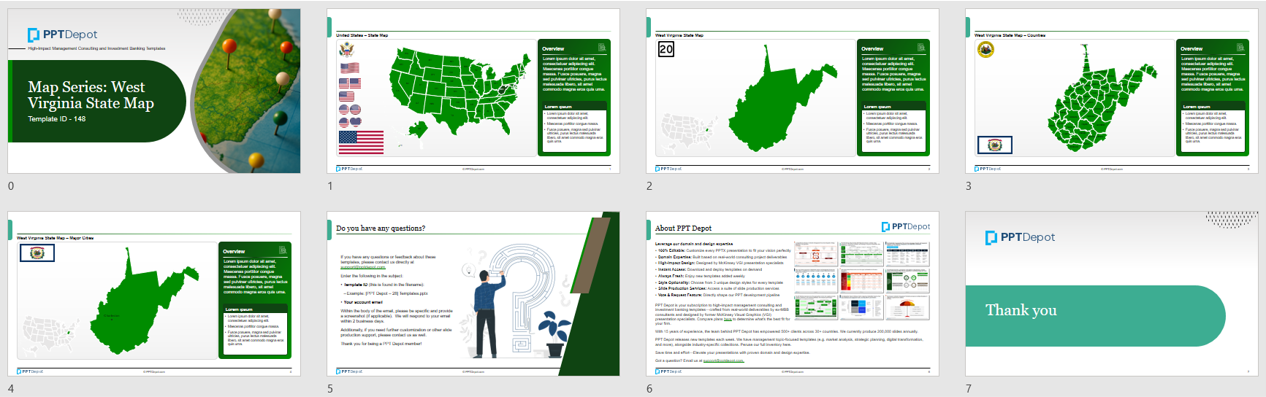 This collection of PPT templates captures the U.S. state of West Virginia, along with its major cities and counties.