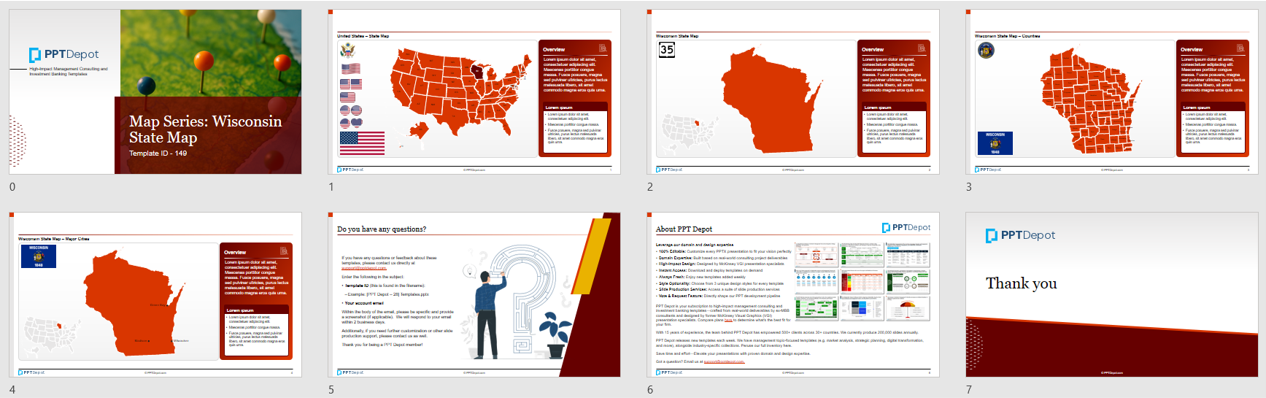 This collection of PPT templates captures the U.S. state of Wisconsin, along with its major cities and counties.