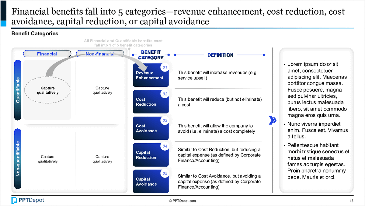 This slide categorizes financial benefits into 5 distinct types: revenue enhancement, cost reduction, cost avoidance, capital reduction, and capital avoidance. It visually separates quantifiable from non-quantifiable benefits and provides definitions for each category, supporting clear communication of value drivers in financial analysis or project justifications.